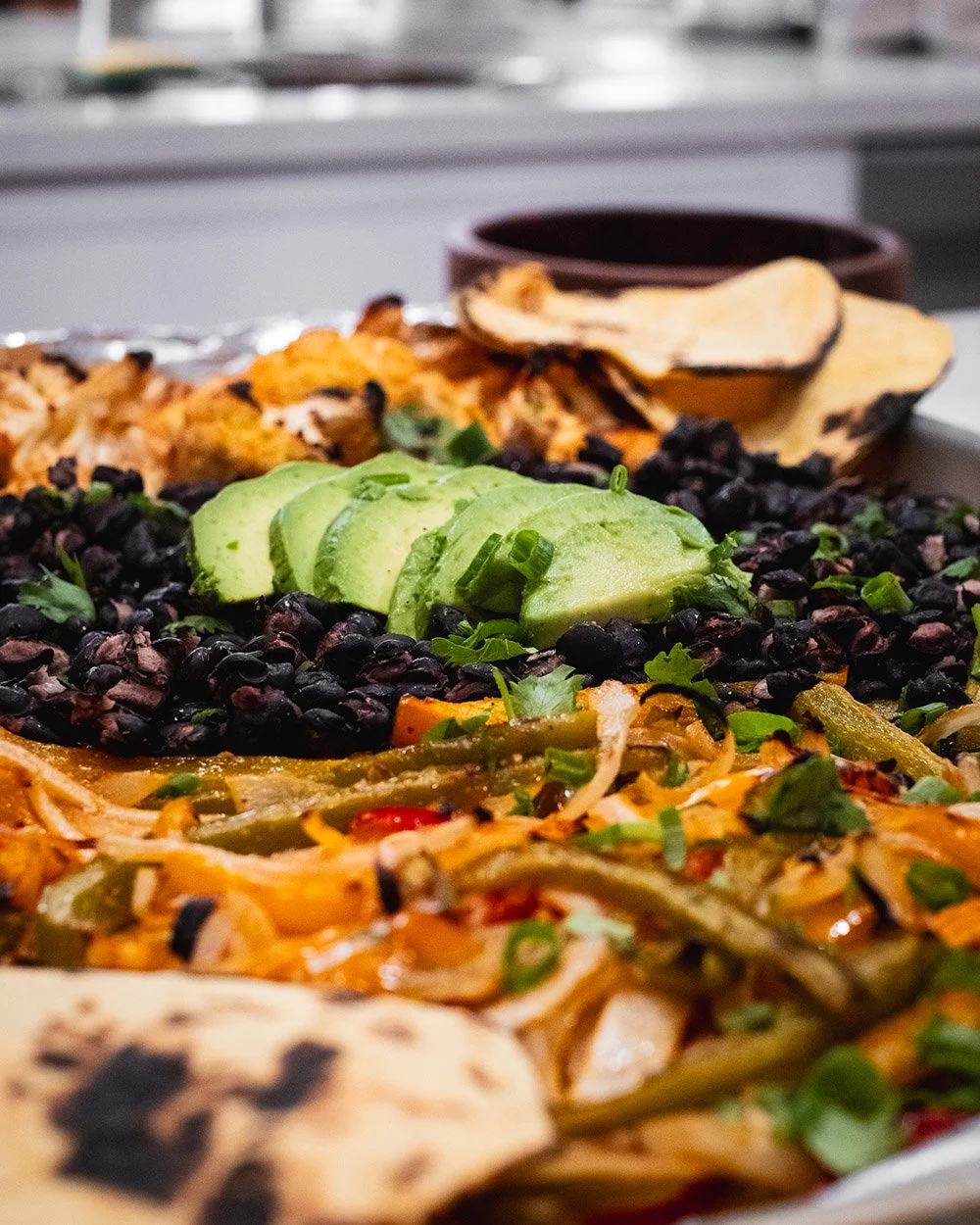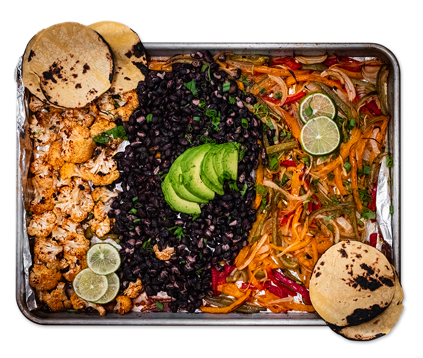 Cut up veggies and place them in a bowl. Place sliced chicken in a separate bowl. Marinade your proteins/veggies liberally! Let that sit for a bit in the fridge. Preheat oven to 400 degrees. Place all the veggies on a sheet pan and throw them in the oven for 30 mins. After about 20 minutes, check the veggies and stir; at this time, put your black beans on the pan as well (this way, they don’t overcook).