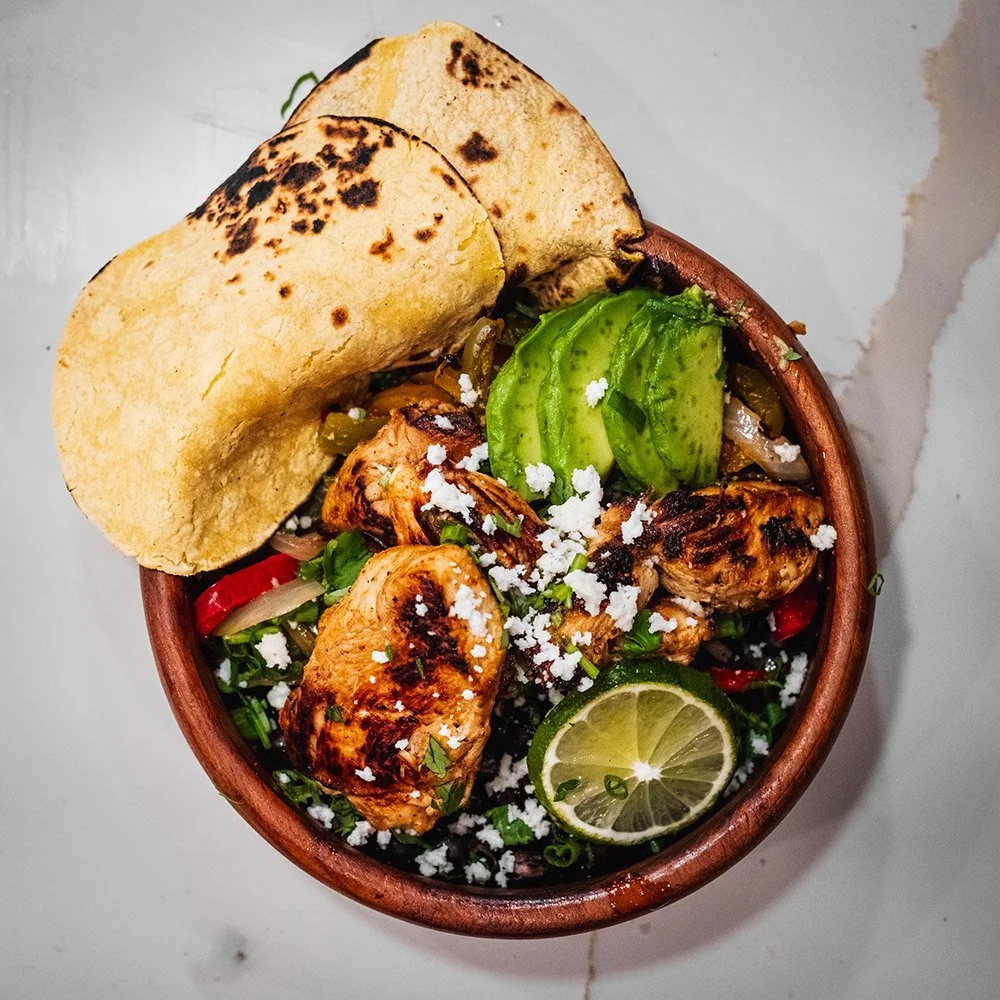 Fire up your tortillas and build your bowl however you’d like, whether in a Tupperware for the shop or a bowl at the house. Both are good!! Top with some fresh cilantro, cotija cheese, and a lime wedge.