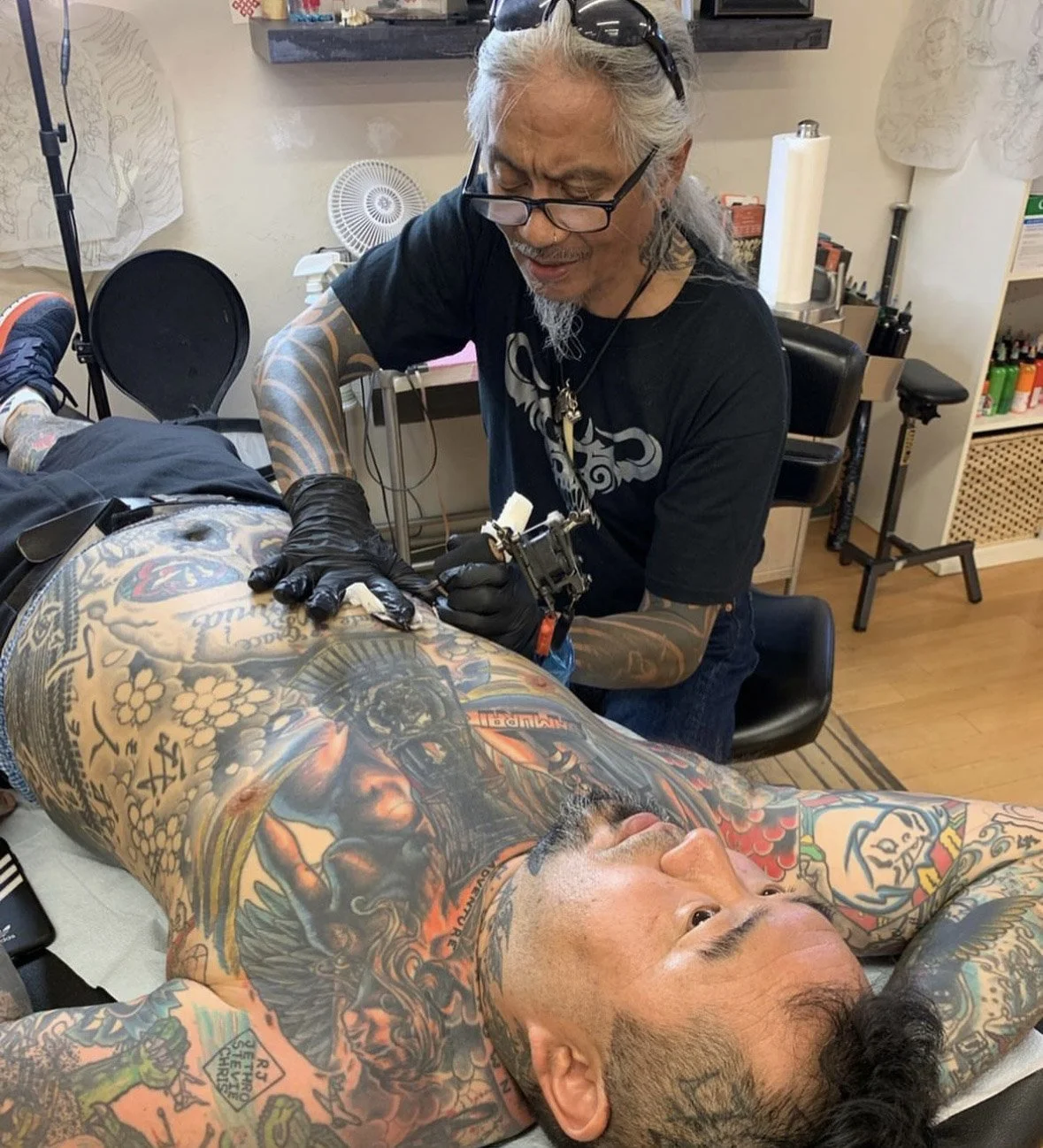 As far as Japanese tattooing and who gets it? This is not for me to say— I don’t care who gets a Japanese tattoo, I don’t care who does a Japanese tattoo, but I want them done well and respectfully. Again, I’m not the tattoo police. That said, for me, including a lot of my clients and people who are Japanese Americans, there’s a special place in their hearts for it. Like the other day, we had a low-rider event here. Everyone around the world knows that Mexican-Americans invented low-riding, but there’s every race out there enjoying it. Japanese Americans are holding onto this connection, maybe they haven’t been to Japan, they don’t speak Japanese, and it’s something that is inherently Japanese that they can celebrate. And if that makes them feel better about themselves and unlocks a little piece of their history and identity, then that’s great.