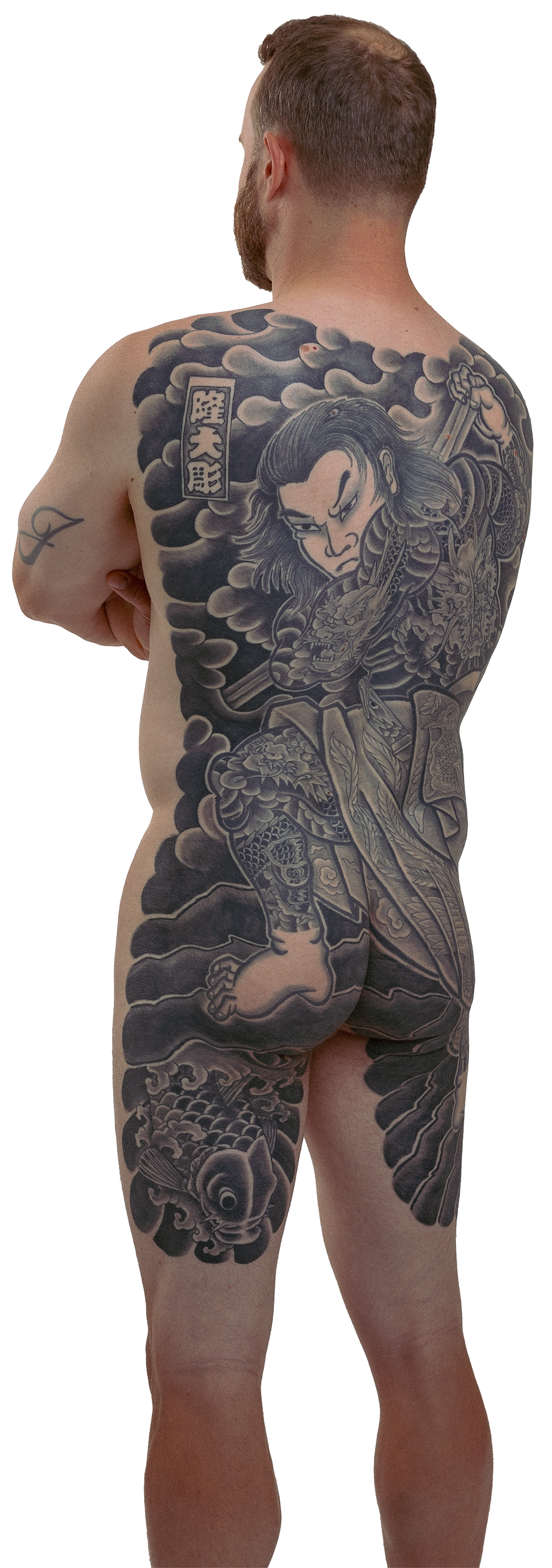 R: I agree with those definitions, but they are largely semantics and cultural differences. Many Japanese will shy away from the artist term, and most people will not look down on craftspeople. Still, they think, for whatever reason, an artist is a higher form. In Japan, it’s very clear that being a Shokunin and working with your hands is something to be proud of; many Japanese national living treasures work with their hands. For example, someone who makes swords with their hands. Fuck, dude, that’s such a high level of artistry. So I understand what you’re saying and what Shige says when he says that. I just talked to him, and he said I’ll be a craftsperson until I die. I see myself at a certain point when I feel like my hands and eyes aren’t good enough. I will stop, but he’s like, no, I have to do this forever. There’s a lot of pride. I say tattooer a lot because I don’t need the title artist. Sometimes I feel like it doesn’t fit, for example, two of the guys today… it’s just straight Kuniyoshi back pieces. I kind of went through this thing of 10 years trying to tattoo like my master, another 10 years trying to not tattoo like him, and now I’m really comfortable with my work style. In the last 5 years, I feel like I’ve hit my stride, and in that comfort, I’m noticing I love tattooing Kuniyoshi just as it is. I feel like Kuniyoshi is the quintessential tattooed, tattooers woodblock print artist. On top of that, I think there are a lot of times you’ll try to re-draw Kuniyoshi, and it’s like, how the fuck am I going to re-draw this? It’s perfect. What I realize is that idea of it being mine. As a beginner, I think there’s a lot of that “this is mine” and “I created it,” even though it references 50 million things that you didn’t create. And now, I don’t need credit for any of that. That’s a badass Kuniyoshi piece I did. I still get the credit for making it with my hands, spending 36 hours with clients, coaching them when they need it, getting coached when I need it, and putting that work in. It’s still hard to tattoo something in. If you look at Japanese tattooing, you think, why is Japanese tattooing so cool? And there are so many different answers, like the culture, the history of it…but on a base visual level, they’re going off woodblock prints. Their references were amazing. Many early woodblock print carvers and tattooers were probably the same people. They built this amazing bodysuit structure where it looks dope, even if the main design isn’t that good if you have the right background around it. I feel even more Japanese, traditional, and authentic when I do a Kuniyoshi piece. It’s not some weird interpretation I had. It’s like that print. When anyone sees it, they know what that is.
