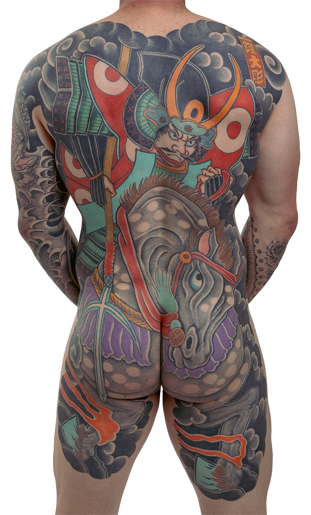 R: I would call it a satellite apprenticeship, and obviously, there are parts of it, I could say, that were less difficult in time commitment than say, what Horitomo did. But at the same time, I don’t think it’s lesser in terms of what it was because it was what HE wanted. That was something that would come up: “how did you get in there?” It wasn’t something that I got into. He offered it to me. You really think, as somebody that’s been tattooing for six months? I thought, I wanna be knocking on that door... like, hey man. You know? But I realized as time went on that he was building something. You know, cause that same year he invited Alex in, titled him (Alex Reinke, “Horikitsune,” Holy Fox tattoo). But it was because he wanted to set up a global thing, and he wanted someone in Europe. I even said it... “If I’m gonna be an apprentice, if I’m a member of the family, does that mean I’m going to move to Japan?” That’s what I assumed, and he said, “No, no, I need you out there.”